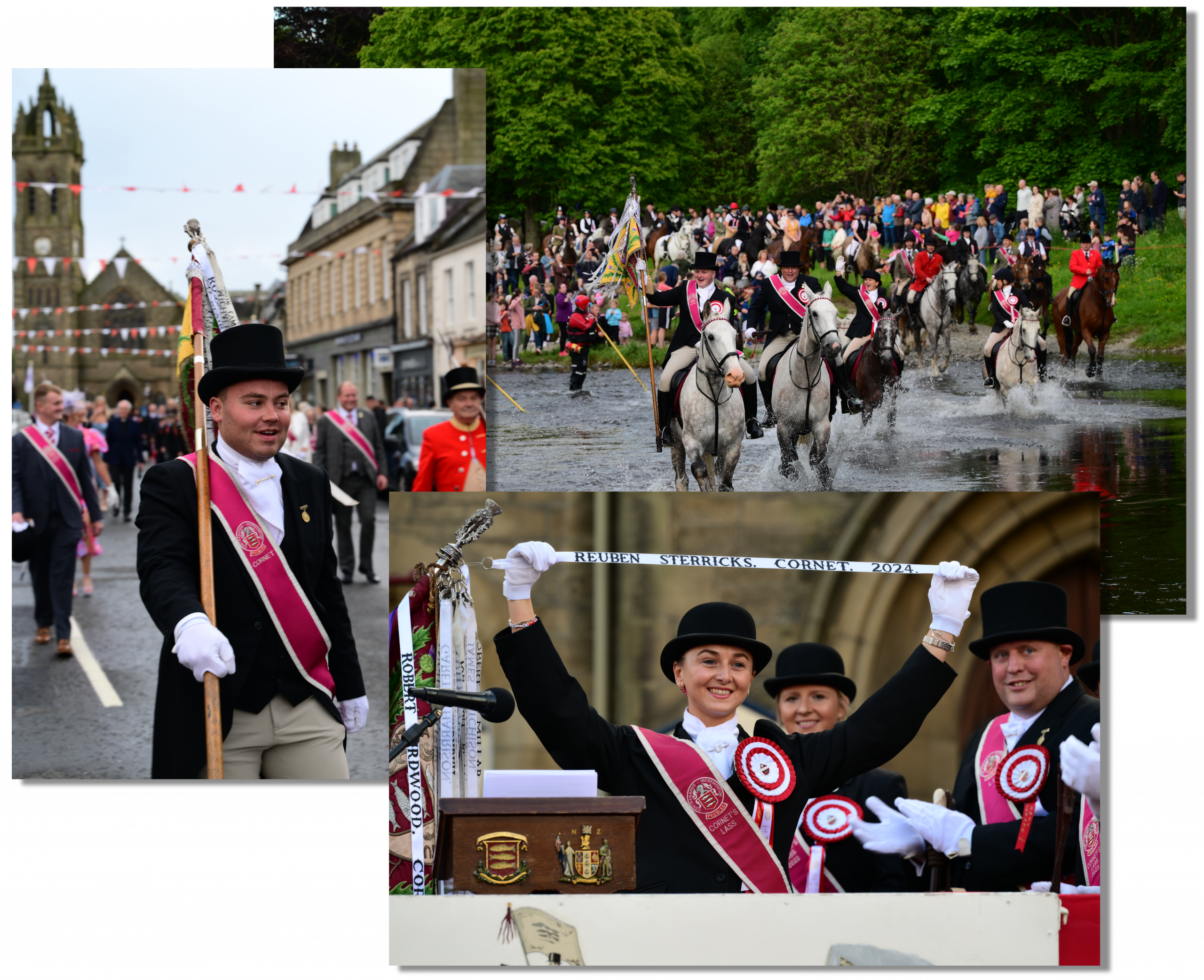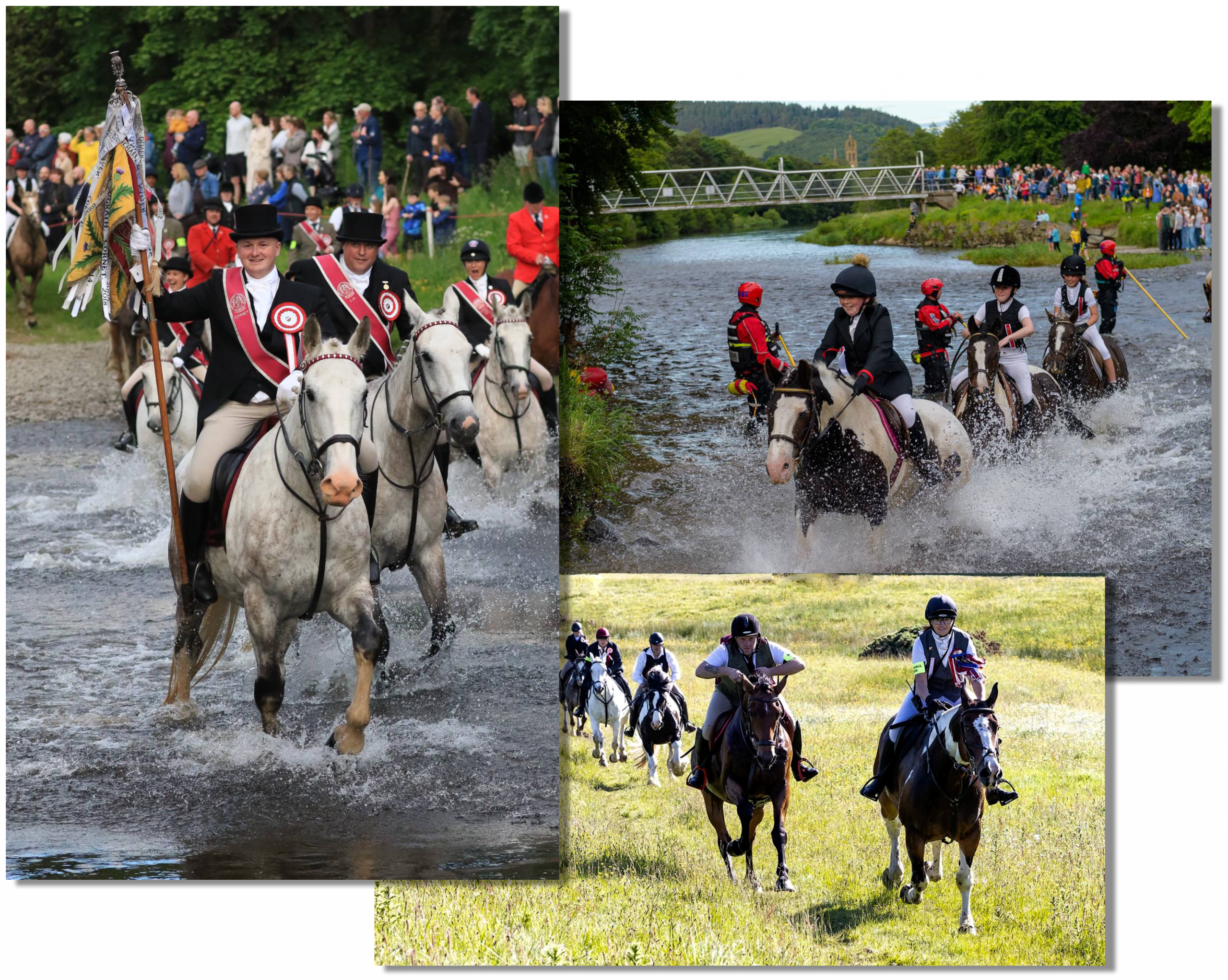 The Beltane Festival, held annually in June, is organised by Peebles March Riding and Beltane Queen Festival Committee. The "March Riding" relates to the historic practice of checking the boundaries of the burgh 'common lands''. The word 'march' was used to denote a boundary, or border, and a 'border district' - used chiefly in the plural - 'marches. 'Riding the Marches' refers to "a ceremony of riding round the bounds of a municipality" The 'Festival' element has its links with the medieval custom of holding an annual sale or fayre, which in many cases was the only 'holiday' in existence for most of the workers, and also has links to the old customs of welcoming the advent of summer. In 1897, to mark Queen Victoria's Diamond Jubilee, Peebles Town Council held a Riding of the Marches. It was decided to resurrect this as an annual event. In 1899, to widen this and involve young people, the Crowning of the Beltane Queen was introduced, and over the years this has grown into a colourful Pageant, - which maintains its origins related to Queen Victoria's Diamond Jubilee. The Riding of the Marches is carried out by the Cornet, as a worthy representative of the town, and his two Supporters, accompanied by a mounted cavalcade. Nominations for the position of Cornet are invited annually by the Committee, and it is a great honour to be appointed as Cornet.