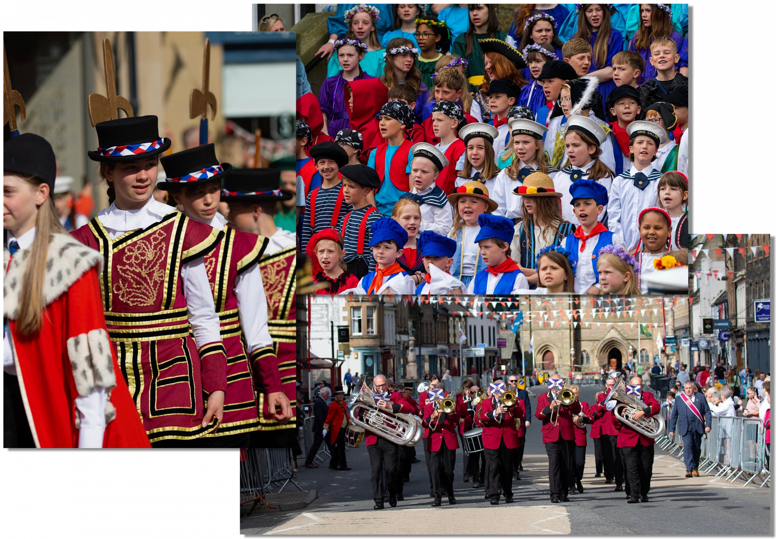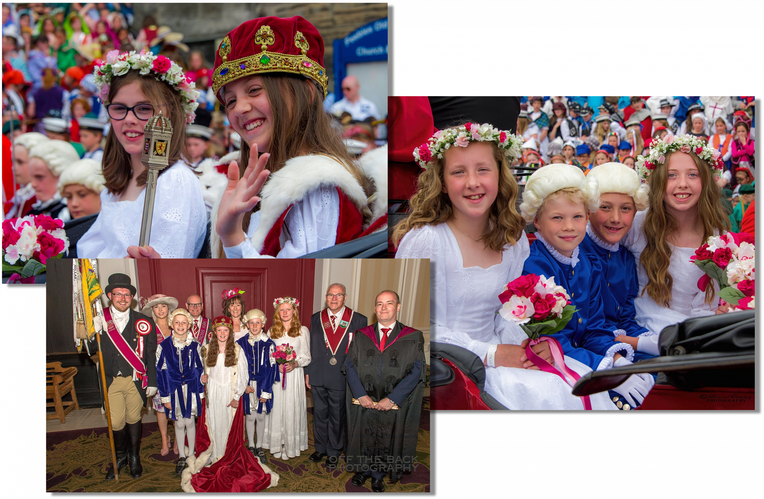 On Saturday morning, the Officials, Principals and invited guests assemble at the Mercat Cross in time to view the children, dressed as 'Characters of the Festival', parading past on their way to the Parish Church for the Crowning Ceremony. The 'Proclamation of Beltane Fair takes place at the Mercat Cross, and the Cornet is awarded his Cornet's Medal. Thereafter, the Peebles Burgh Silver Band , together with the Ex-Servicemen's Pipe Band , leads the Official Party and guests along High Street, to where the gaily costumed children are in place on the steps of the Old Parish Church. The Cornet escorts the Beltane Queen's coach to the Church Steps. The dignified procedures of the Crowning Ceremony then take place, and the spectacle has to be seen to be appreciated. The official ceremonies for the week come to a close on the Saturday evening as the Bands Beat Retreat on High Street. Different Bands are invited each year, often including Military Bands.
